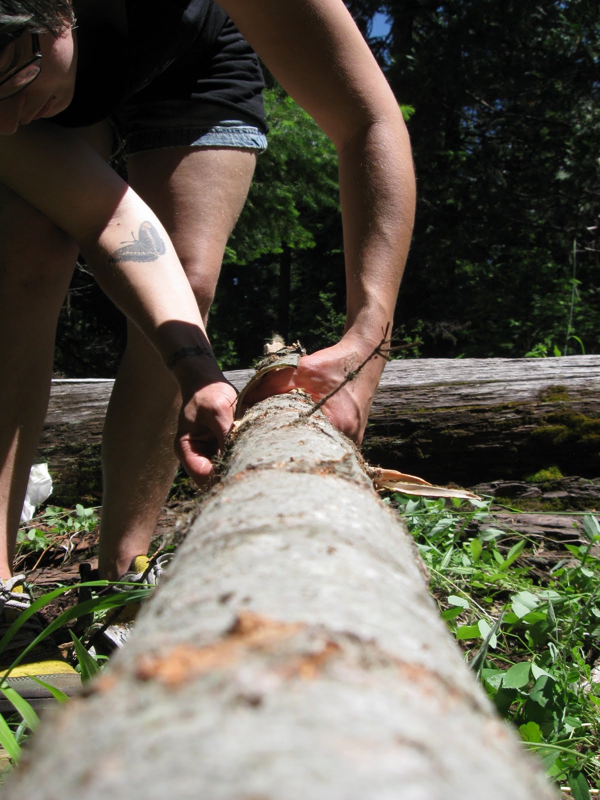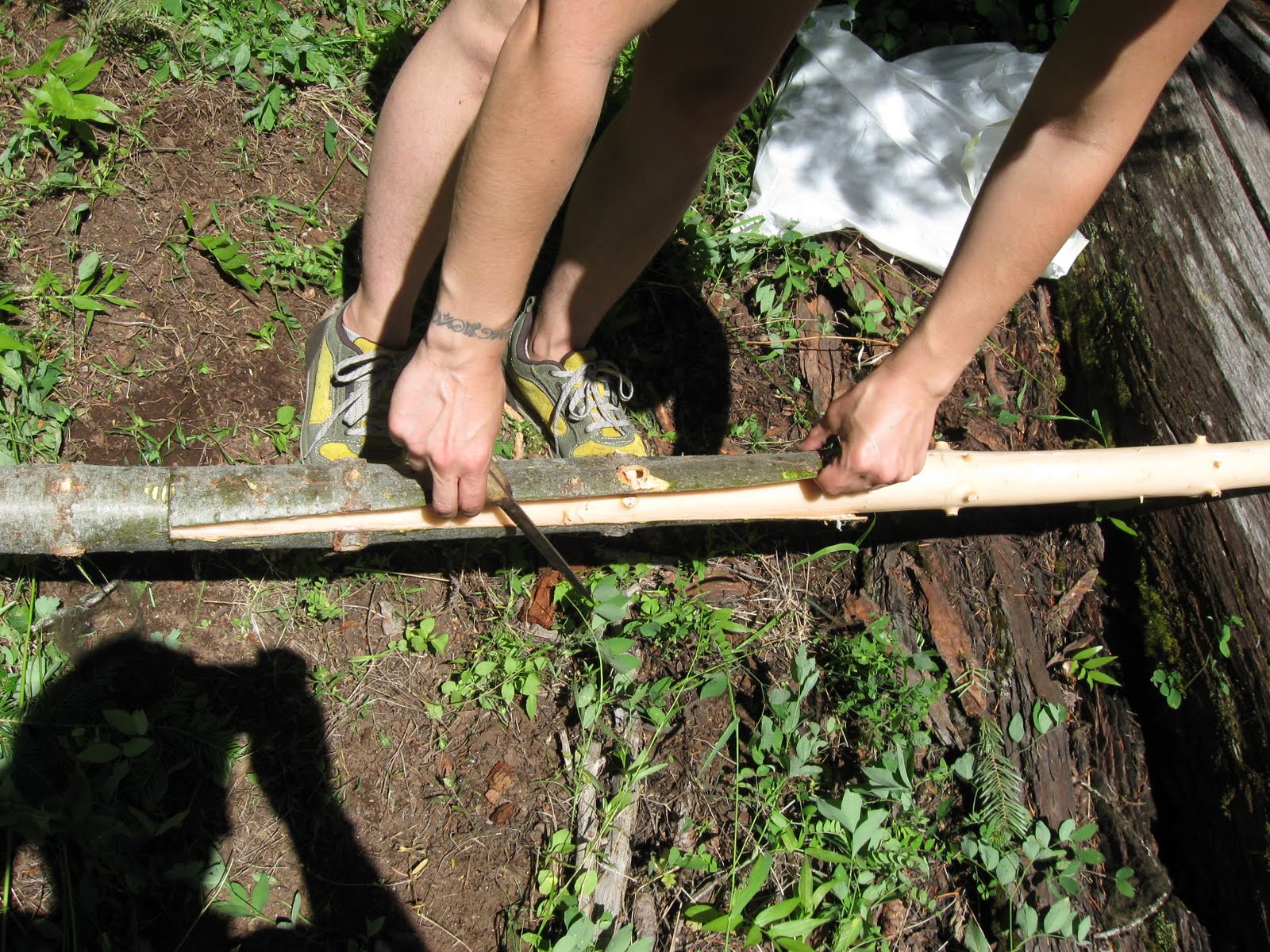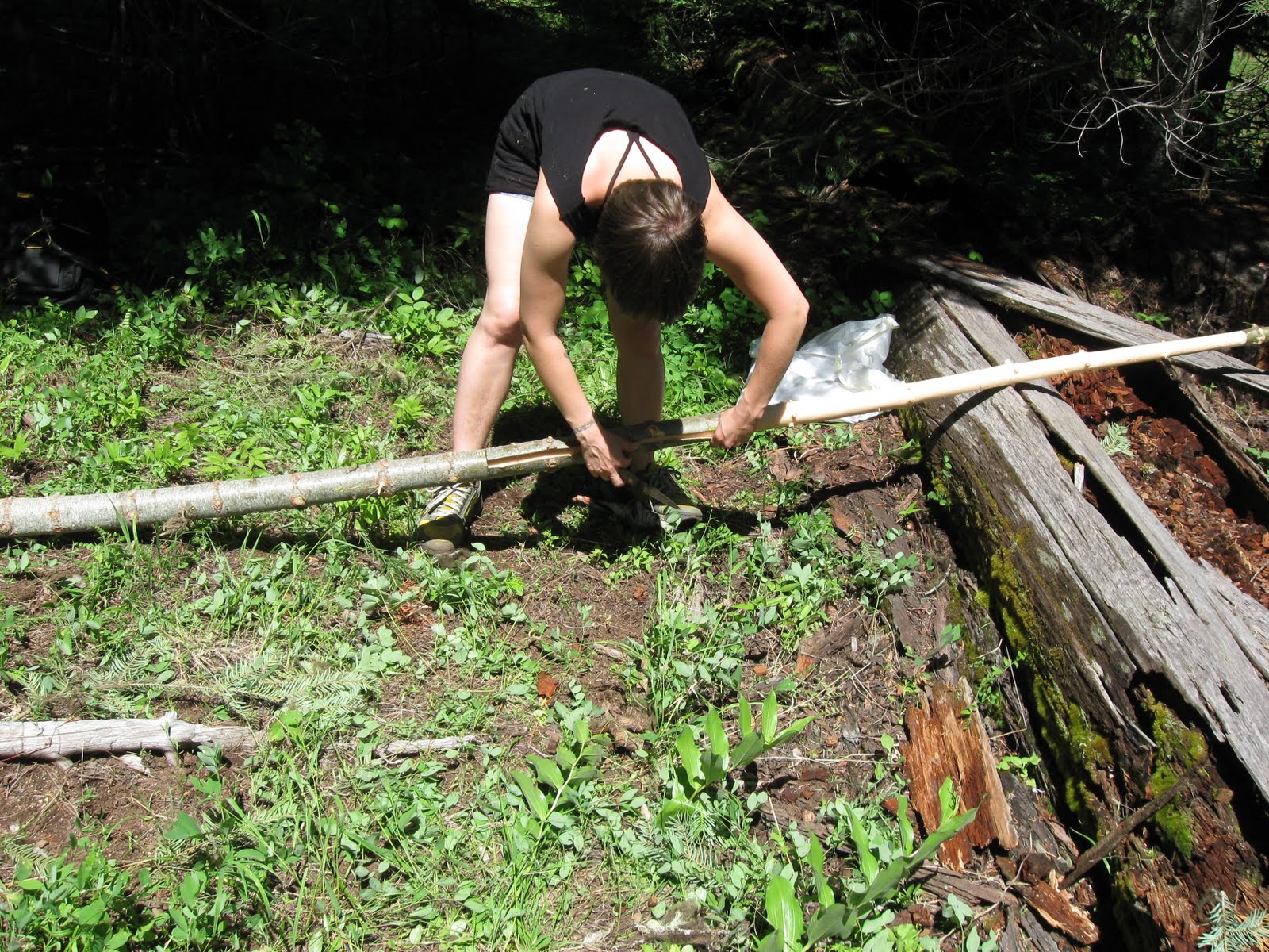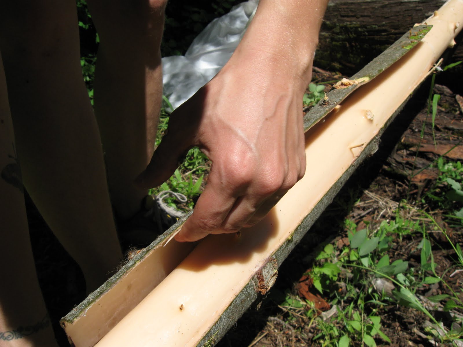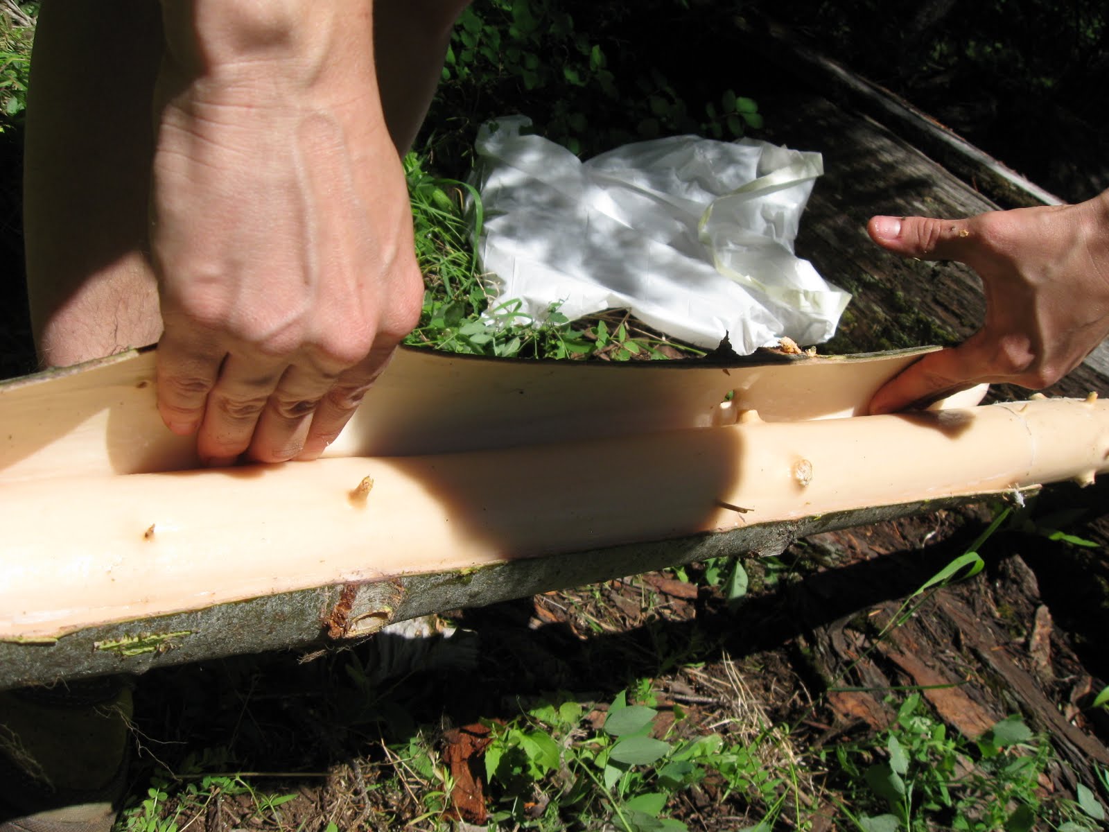 After the tree is cut, the limbs are removed as close to the trunk as possible. This limits the risk of bark being snagged on a limb stump during peeling. Once the tree is ready, the initial cuts must be made. The length of bark you decide to cut should be a little more than twice the length of the basket you want to make (since the bark will essentially be folded in half). Make two cuts around the circumference of the tree, and then one long cut running the length of the tree connecting the first two cuts. Make sure your cuts go all the way through the bark and keep your knife handy during the peeling process!