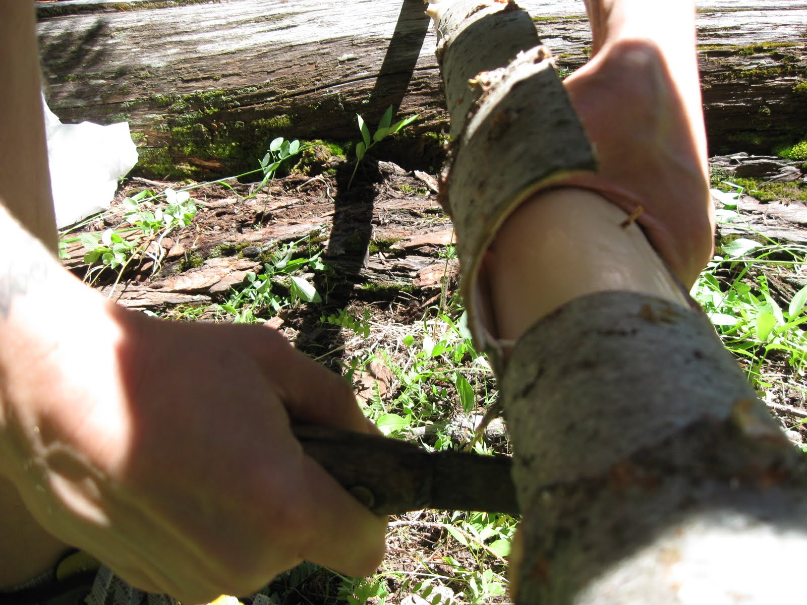 Loosening the bark. Do this VERY slowly. Loosen bark all the way around "holes" (where branches once were) until the bark "pops" off around the hole. |
