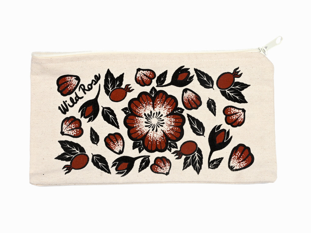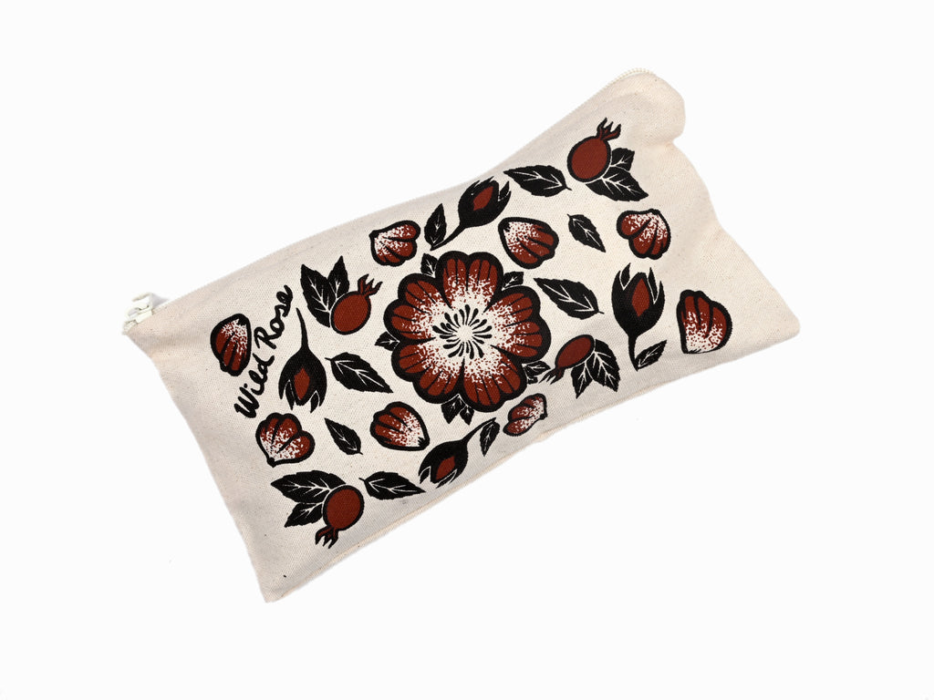 Keep your sundries secure in this limited edition Wild Rose organic canvas bag! Printed by hand in our homestead studio using water-based inks on an American-made zippered bag in unbleached organic cotton canvas.